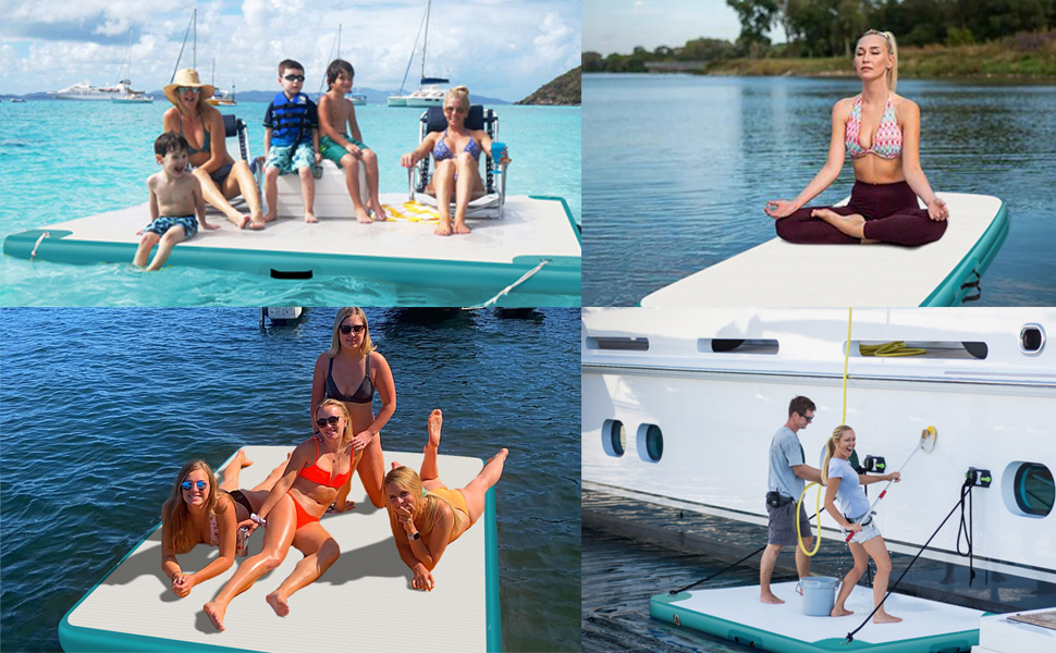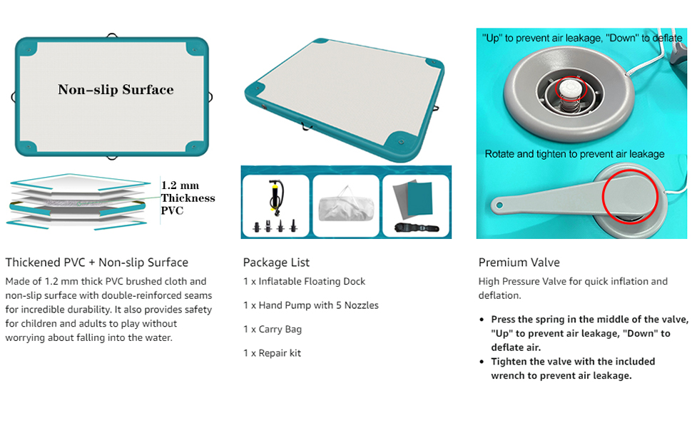 Getting the Dock on and off the water is simple. First unfold the folded dock, choose the corresponding nozzles, attach the pump hose to the inflation valve and fill 'er up, when the Dock is solid, close the inflation valve.