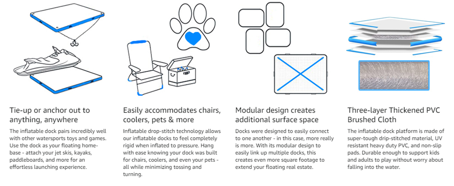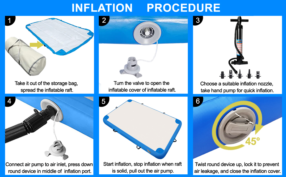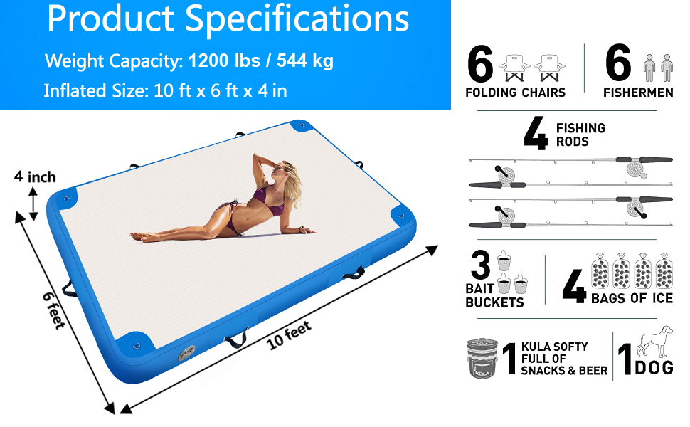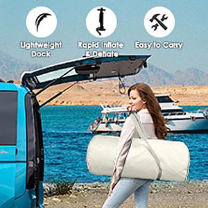 Inflatable floating dock provides a storage bag that is easy to store and carry. Docks fold incredibly compact into their included carry bags when deflated. They easily fit in most storage compartments, are easy to bring with you wherever you go. Easily pack it up into your car’s trunk for an amazing day out on the lake or drifting down the river!