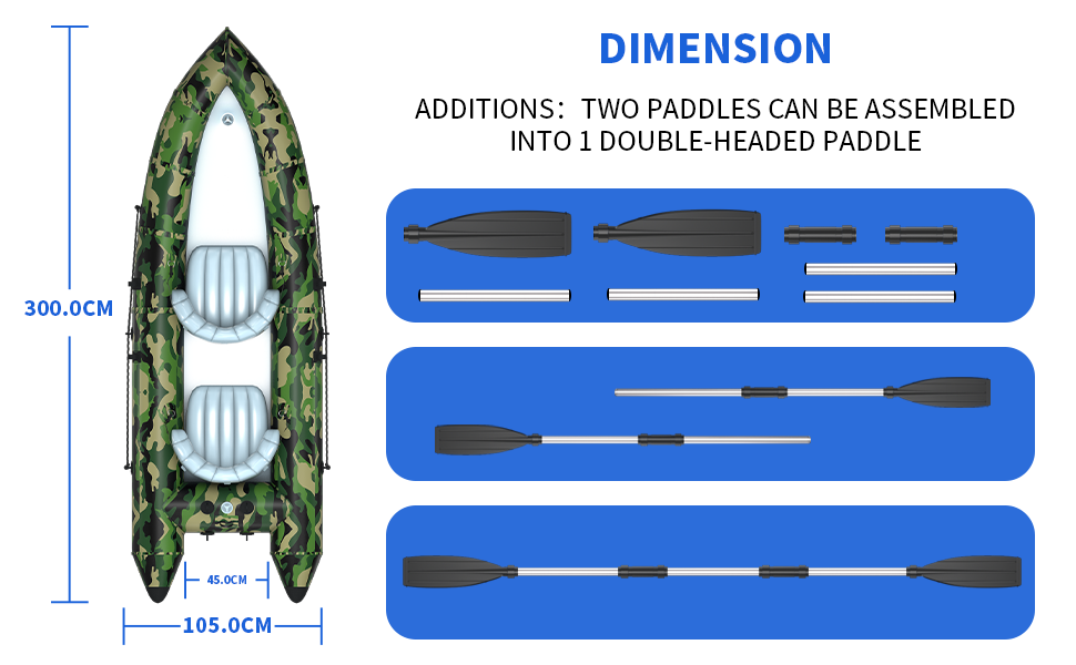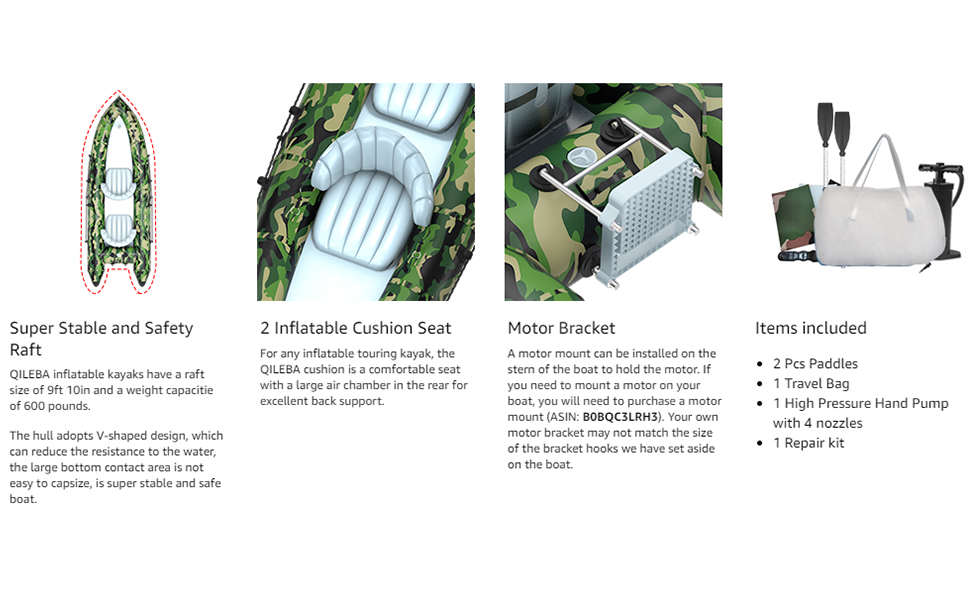 | Included Components | Kayak boat, Carrying backpack, 2 Paddles, Air pump, Patches |